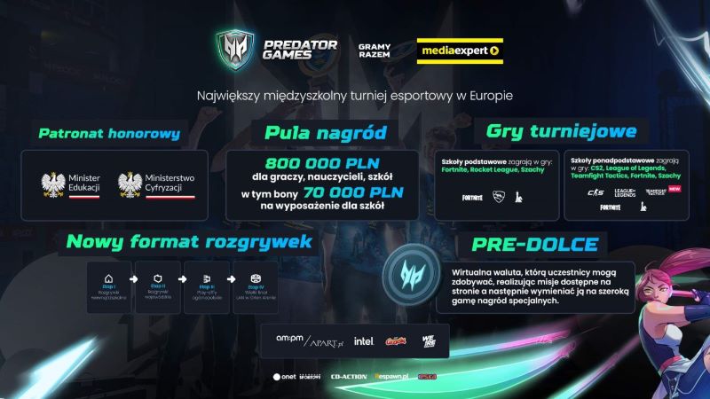 Projekt wspierają partnerzy: Media Expert, Apart. z marką smartwatchy AM:PM, Intel oraz Grześki. Patronat medialny objęły: Onet, Przegląd Sportowy, Radio ESKA, CD-Action i Respawn. Turniej wspiera także grono popularnych influencerów i streamerów, w tym Jakub „Jacob” Wrotniak, Adrian „Manoyek” Molenda, Piotr „izak” Skowyrski, Damian „Nervarien” Ziaja, Kinga Kujawska i wielu innych.Predator Games to inicjatywa, która pokazuje, jak ważna jest współpraca biznesu, mediów i szkół w tworzeniu nowoczesnych projektów edukacyjno-technologicznych. Media Expert jest partnerem tego projektu od jego pierwszej edycji. I niezmiennie czujemy satysfakcję, że możemy być częścią przedsięwzięcia o tak dużym potencjale i pozytywnym wpływie, a jednocześnie szerzej wspierać cyfrowe zmiany, które z takim powodzeniem dokonują się w Polsce - mówi Michał Mystkowski, rzecznik prasowy Media Expert.